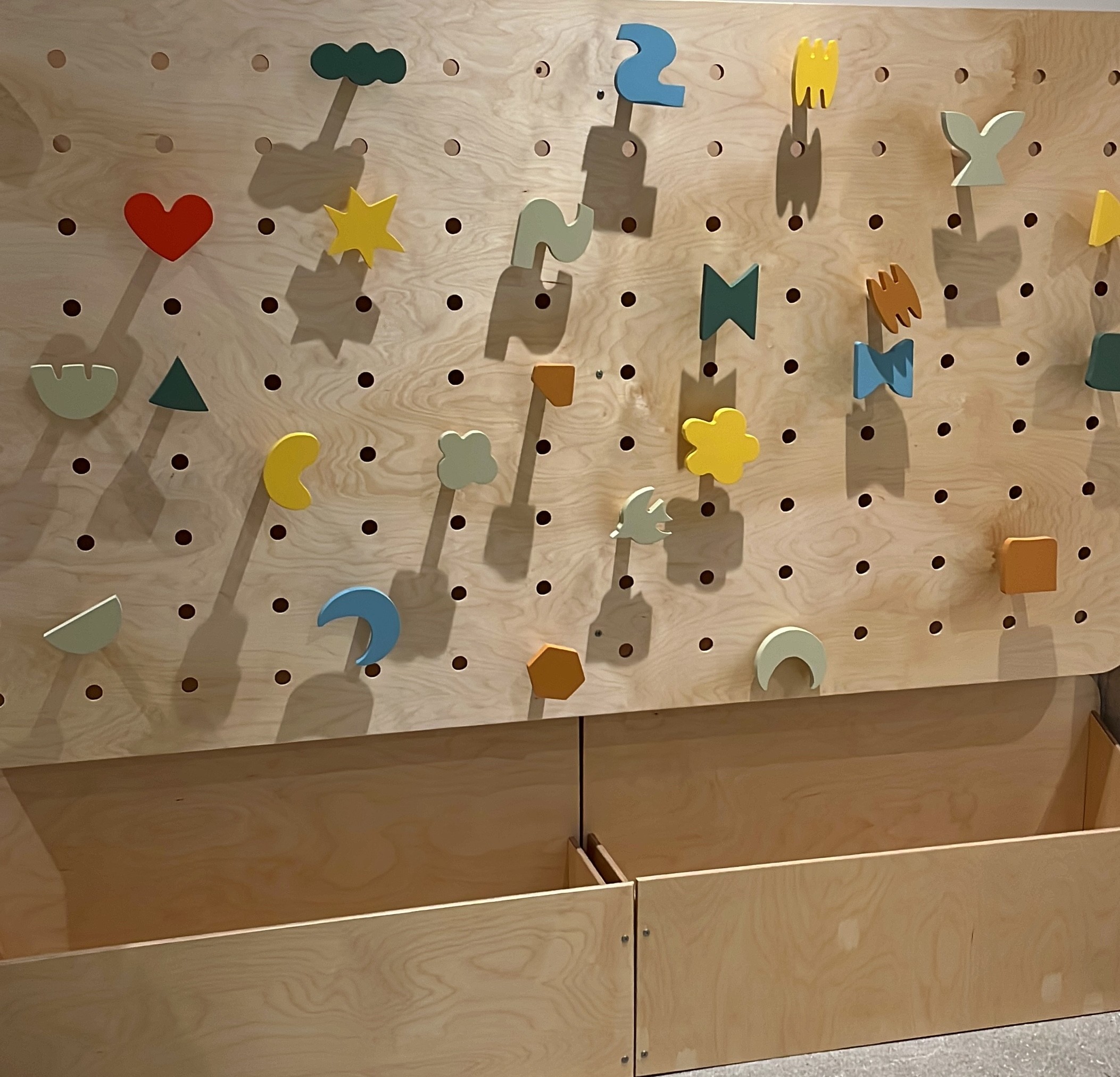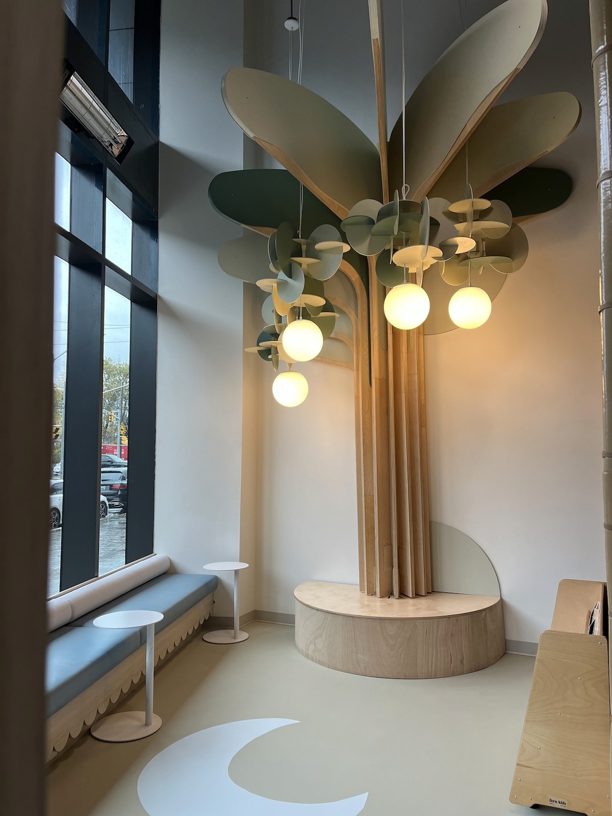 At Adventure Alley, Fern Studio collaborated with designer Jordana Leventhal to create a one-of-a-kind play environment centered around a 16-foot custom tree with an elevated loft and slide. Surrounding the tree, children can explore a pegboard wall, interactive busy boards, and a kinetic sand table—each crafted to encourage hands-on discovery and imaginative play.